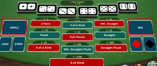 5 Of a Kind adalah menebak hasil dadu keluar dengan angka kembar sebanyak 5 dadu contoh 5-5-5-5-5 (semua angka dengan dadu kembar 5)