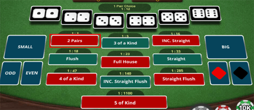 2 Pair adalah menebak hasil dadu keluar dengan angka kembar sebanyak 2 pasang dadu contoh 4-4-2-2-1 (semua 2 pair dengan angka apapun)