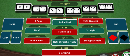 3 Of a Kind adalah menebak hasil dadu keluar dengan angka kembar sebanyak 3 dadu contoh 4-4-4-1-3 (semua angka dengan dadu kembar 3)