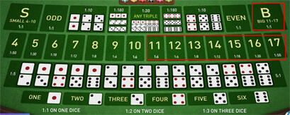 Big (besar) Jumlah dari ketiga buah dadu adalah 11 sampai 17. pembayaran 1 x Pasangan. Triple dadu tidak termasuk besar. ![]() |